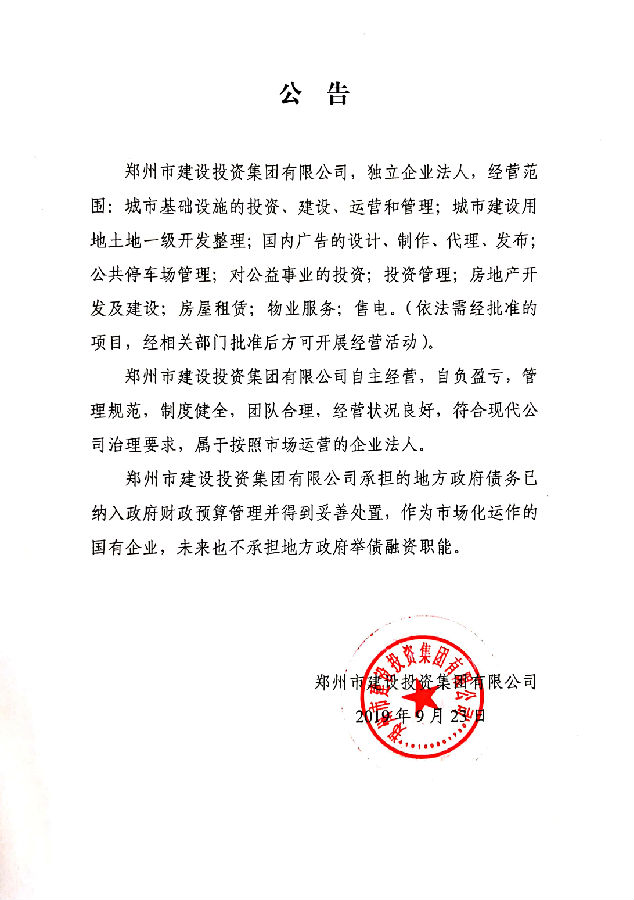 鄭州市建設(shè)投資集團(tuán)有限公司不承擔(dān)地方政府舉債融資職能的公告