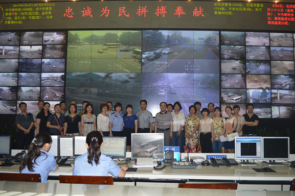接著大家來到鐫刻有“忠誠為民、拼搏奉獻”字樣的全市交通路況顯示屏前。大屏幕上顯示著鄭州市各個主要單位、部位和重要道路交叉路口的即時信息,具有GPS定位功能的警車在不停地移動,視頻畫面依序切換,“原來每時每刻都有幾百輛警車在街面巡邏,每個路口都有監控??礃幼?,鄭州市的安保工作還是有保障的,以后更要規范自己的言行,遵守交通規則”大家很是感慨。